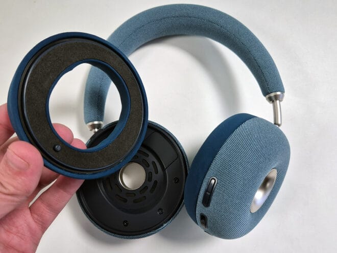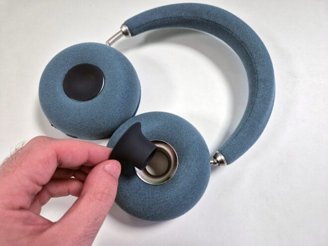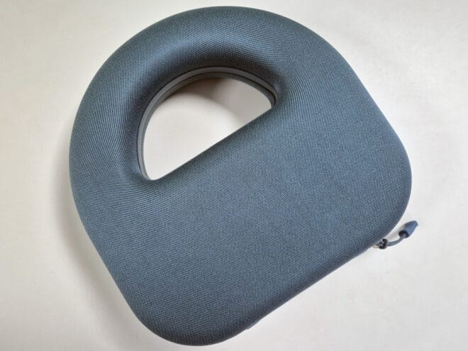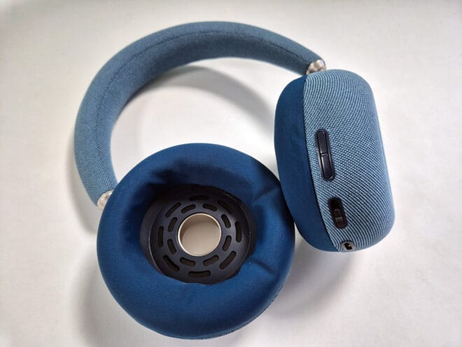 On va retrouver sur l’oreillette droite, le port de charge en USB C, le bouton d’allumage/appairage et les boutons de volume. Le casque se veut minimaliste et aucune mention de la marque n’est visible sur le casque par exemple. Il nous a été envoyé avec son étui de transport que voici :